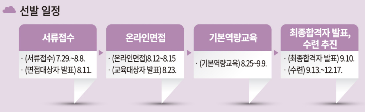 먼저 서류접수를 통해서 지원서와 자기소개서를 제출합니다. 가까운 시일 내에 면접대상자가 발표되고 면접은 AI면접이며 온라인으로 진행됩니다. 온라인 면접을 마치고 합격하면 교육대상자가 됩니다. 약 2주간의 기본역량 교육을 통해서 수련에 필요한 이론을 온라인으로 배우게 됩니다. 기본역량 교육 후 관련 내용 평가를 진행하며 60점 이상이면 통과이고 60점 미만이면 과락이지만 다음날 한 번 더 시험을 볼 수 있습니다. 물론 1차 시험과 동등한 평가기준을 적용받을 수는 없습니다. 서류, 면접, 평가 결과를 종합적으로 고려하여 고득점순으로 최종합격자를 선발합니다. 성적에 따라서 기관 선택을 먼저 할 수 있는 기회가 주어집니다.