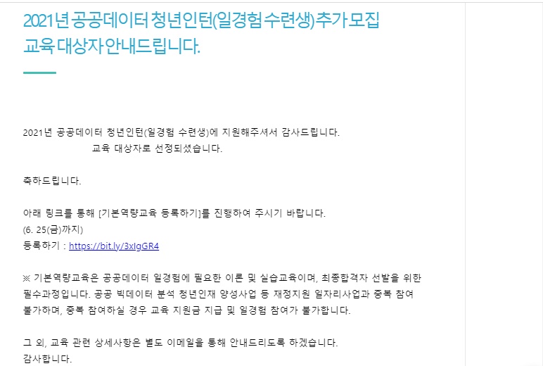 교육대상자 발표까지는 시간이 좀 걸립니다. 최종 합격하게 되면 기본역량 교육 등록 안내 메일이 옵니다. 다음 글에서는 기본역량교육과 최종 합격까지의 과정에 대해서 알려드리겠습니다. 감사합니다.