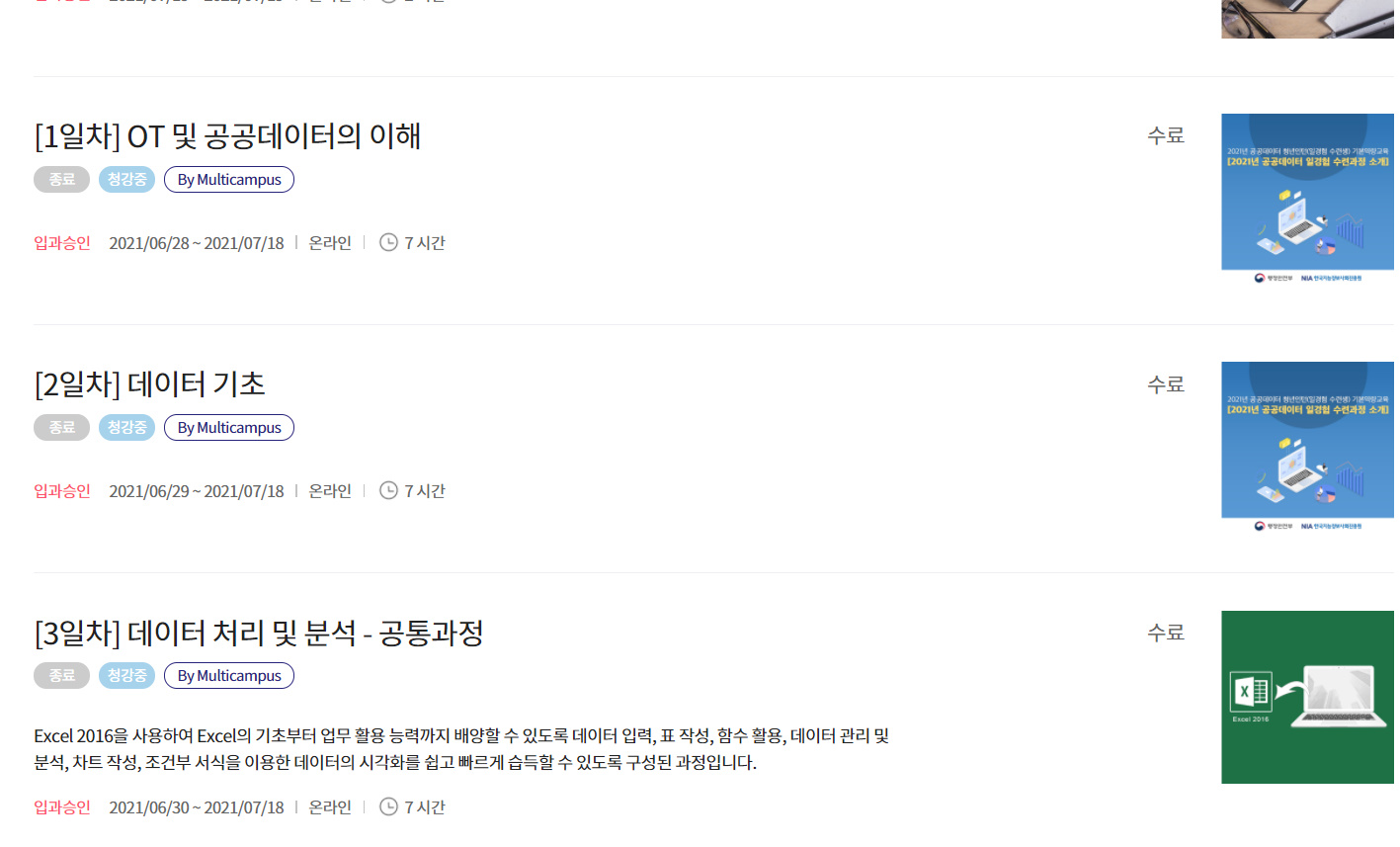 15일 차까지의 강의가 이런 식으로 날짜에 맞게 올라옵니다. 강의는 진도율의 80% 이상만 들으면 수료이며 당일에 올라온 강의는 꼭 당일까지 수강할 필요는 없고 아래에 나와있는 교육기간 내에만 수강하시면 됩니다. 강의를 다 듣지 않으면 강의를 수강해야 수료할 수 있다는 안내 메일까지 오기 때문에 매일 억지로 수강할 필요는 없고 여유를 가지고 수강하시면 됩니다. 물론 강의의 양이 생각보다 많고 지루한 내용도 있어서 밀리게 되면 계속 밀려서 강의를 듣기 힘들어집니다.