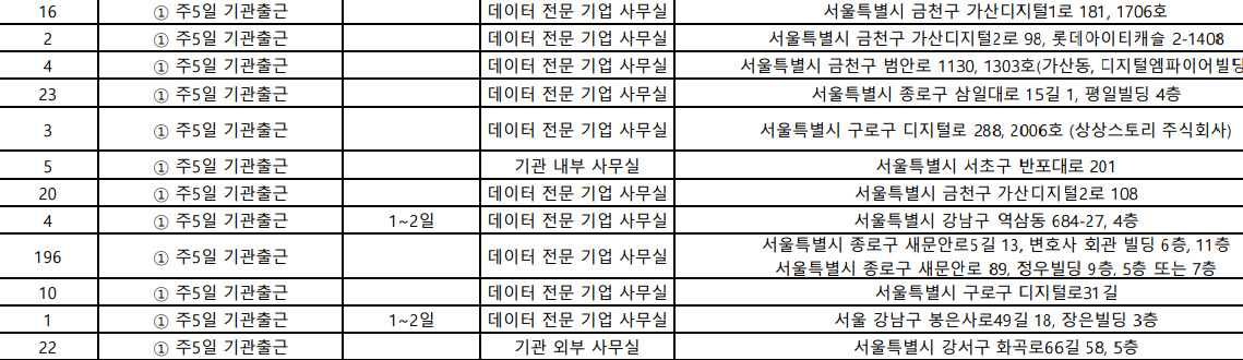 기관 선택 자료를 보면 기관명, 부서명, 업무 내용, 모집인원, 수련 형태(실측, 기관 출근, 재택), 주소를 자세하게 알 수 있습니다. 저는 추가 모집이라서 인기 있는 기관은 이미 다 선택되어서 남은 실측 근무를 선택했습니다. 물론 재택근무가 많은 사람들이 선호하는 근무지만 재택근무를 한다고 했지만 안 할 수도 있고 기관 출근을 한다고 했지만 상황에 따라서 재택근무로 전환될 수도 있습니다. 결국은 모든 게 운입니다. 저도 여름에 실측 근무를 하면서 잠깐 힘들었는데 다시 생각해보니 실측 근무도 좋습니다. 자세하게 설명드릴 수는 없지만 일단 실측 비용으로 하루에 1만 원을 더 준다는 점도 좋습니다. 그래서 모든 게 운이기 때문에 경험해보고 싶은 기관이 있다면 그곳을 선택하시면 되고 없다면 집 가까운 게 최고인 것 같습니다.