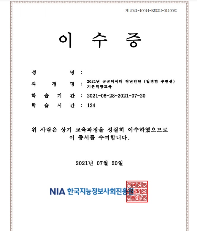 | 공공데이터 청년인턴(일경험 수련생) 지원 후기(1) (1) | 2021.08.19 |