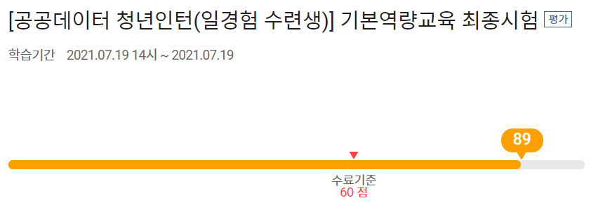 기본역량교육 최종 시험은 교육사이트를 통해서 진행됩니다. 시험 범위는 4-7일 차 내용을 제외한 모든 강의에서 출제됩니다. 시험은 14시~16시에 진행되었고 총 40문항입니다. 과락 시에는 다음날 같은 시간에 재시험의 기회가 주어지지만 최초 시험과 동일한 평가점수를 얻을 수는 없습니다. 그래서 최초 시험보다 재시험 점수가 더 높아도 평가점수는 더 낮습니다. 학습 진도율 80%, 최종 시험 60점 이상을 만족하면 기본역량 교육을 최종 이수하여 기관을 선택할 수 있습니다. 시험은 정말로 학습자료로 제시해준 pdf파일에서 그대로 나오고 상식선에서 풀 수 있는 문제도 있기 때문에 시험에 대한 부담은 적습니다. OCR을 이용해서 pdf파일을 통합하여 검색만 제대로 할 줄 안다면 시험은 무난하게 합격할 수 있습니다. 안내사항에는 Alt-Tab 불가능하다고 하니까 컴퓨터 두대를 사용하시던지 듀얼 모니터를 사용하시면 됩니다. 정말로 공부를 하신 분들은 문제가 없습니다. 강의가 밀려서 들을 시간도 없는 분들은 pdf파일을 보고 각 파트가 어느 부분에 있는지만 숙지하시고 검색만으로 시험을 보셔도 됩니다. 저도 듣다가 중간에 자격증 시험공부랑 겹쳐서 그냥 강의만 틀어놓고 검색만으로 시험을 봤습니다. 객관식이기 때문에 문제의 키워드나 답의 키워드를 검색하면 쉽게 답을 고를 수 있습니다. 대학교 비대면 시험을 경험해보신 분들은 제 말이 무슨 말인지 잘 아실 거라고 믿습니다.