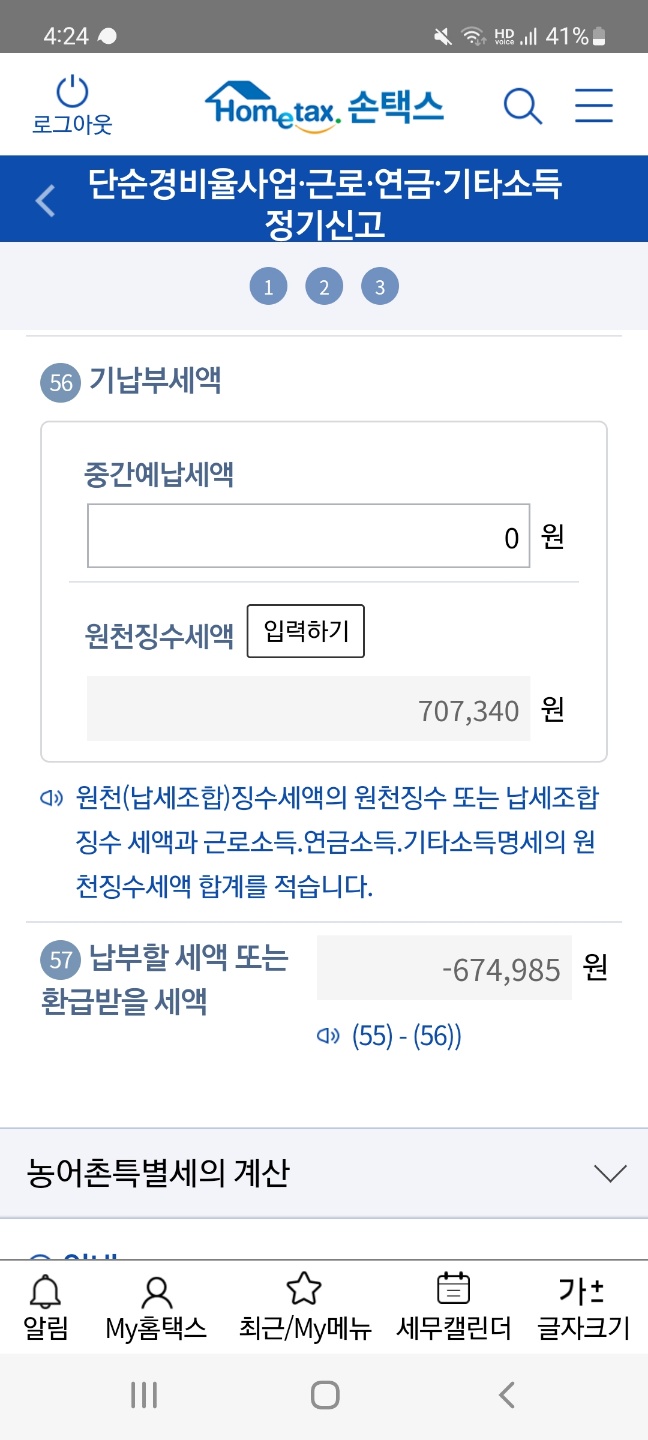 그러면 보시는 것처럼 납부할 세액 또는 환급받을 세액에 돌려받을 수 있는 금액이 나타납니다. 저는 674,985원입니다. 공공데이터 청년인턴 외에도 경품이나 상금 등의 소득이 있어서 더 받는 것 같습니다.
